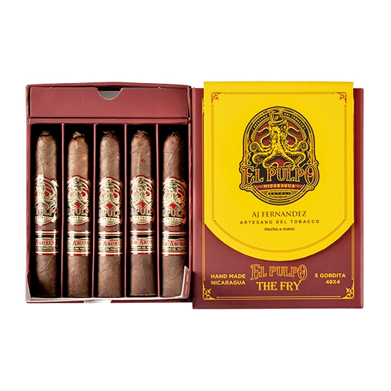 The El Pulpo Gordita “The Fry” by Artesano del Tobacco delivers Nicaraguan medium-full intensity in its compact 102mm x 48 ring gauge gordita vitola with pigtail cap, hand-rolled at AJ Fernandez’s San Lotano factory using specially fermented Mexican San Andrés maduro wrapper over Nicaraguan Jalapa Estelà binder and Fernandez-farm fillers, packaged in 5-packs of 5 within magnetic-lid boxes with match striker cutouts. Oily maduro unleashes creamy earth, black pepper vibrancy, espresso grit, light tobacco sweetness, and subtle creaminess evolving medium-full over 20-40 minutes with firm draw, even burn, and solid ash—demanding paced puffs to tame sharpness. Ideal quick blasts for veterans post-meal with rum; excels rested 3-6 months.